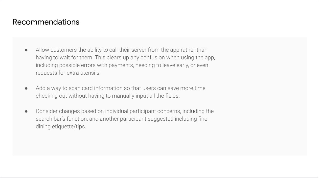 This user group confirmed initial assumptions about the fancy food restaurant’s customers, but research also revealed that the complexity of the menu was not the only factor limiting users from having a comfortable dining experience. Other user problems included inclusivity, accessibility, and social etiquette expectations.